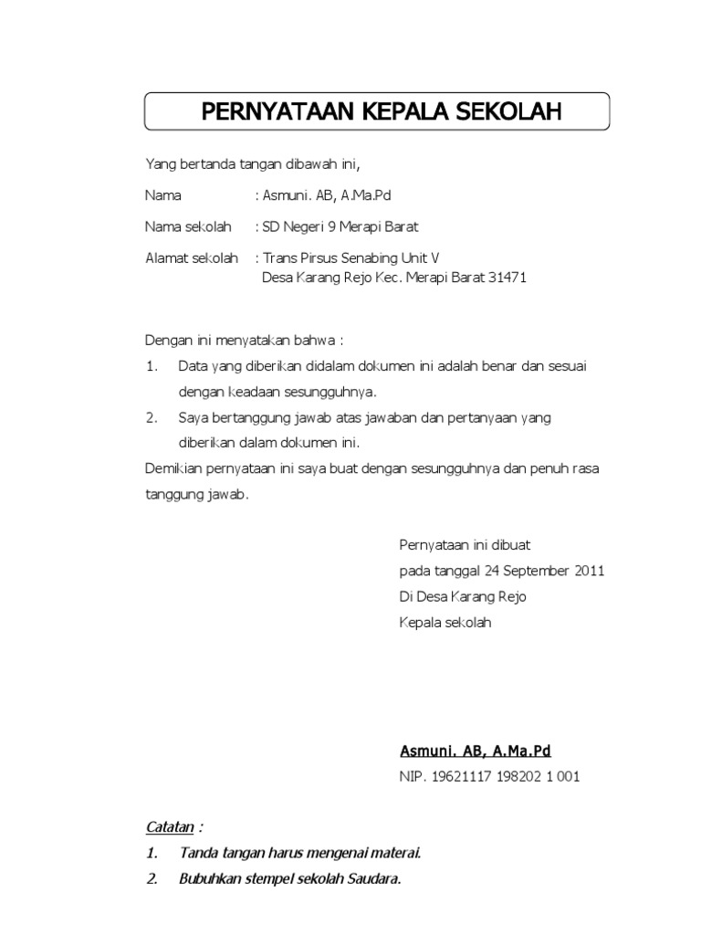 Contoh surat pernyataan kepala sekolah untuk akreditasi.