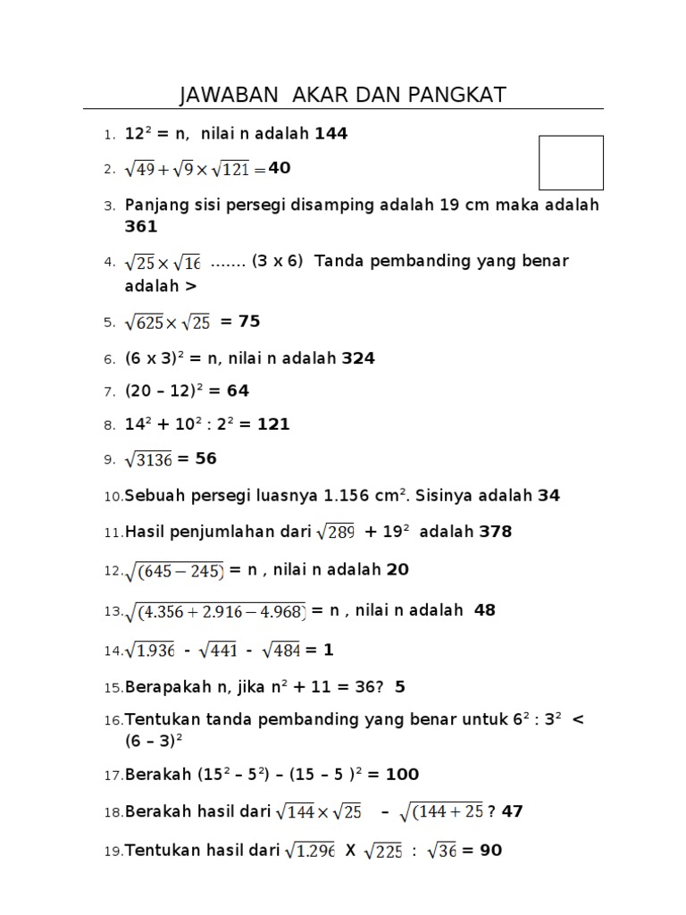 untuk "Hasil Dari Akar 324 Adalah - Jawaban Pangkat Dan Akar Kelas 5 - √ 100 = 10 b."