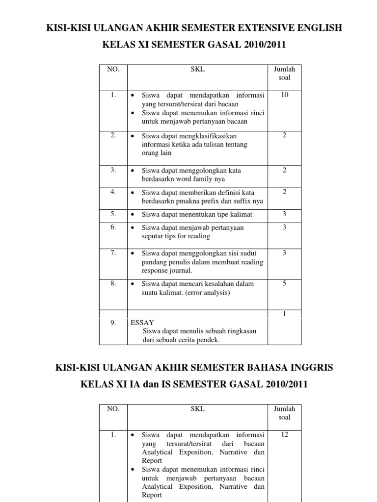 Kisi kisi penulisan soal bahasa inggris kelas x sma/ma semester 1 tahun pelajaran 2015 jenis sekolah : Kisi kisi penilaian akhir semester 1 bahasa indonesia sma ma kelas. Kisi kisi pas bahasa inggris kelas 11 tahun 2019 2020. Kisi kisi ujian nasional smk dan mak 2019 soal bahasa indonesia. Kegiatan uas biasanya dilaksanakan pada bulan desember yang mana setiap guru tentunya harus membuat berbagai persiapan terkait kegiatan ini seperti kisi kisi dan soal.